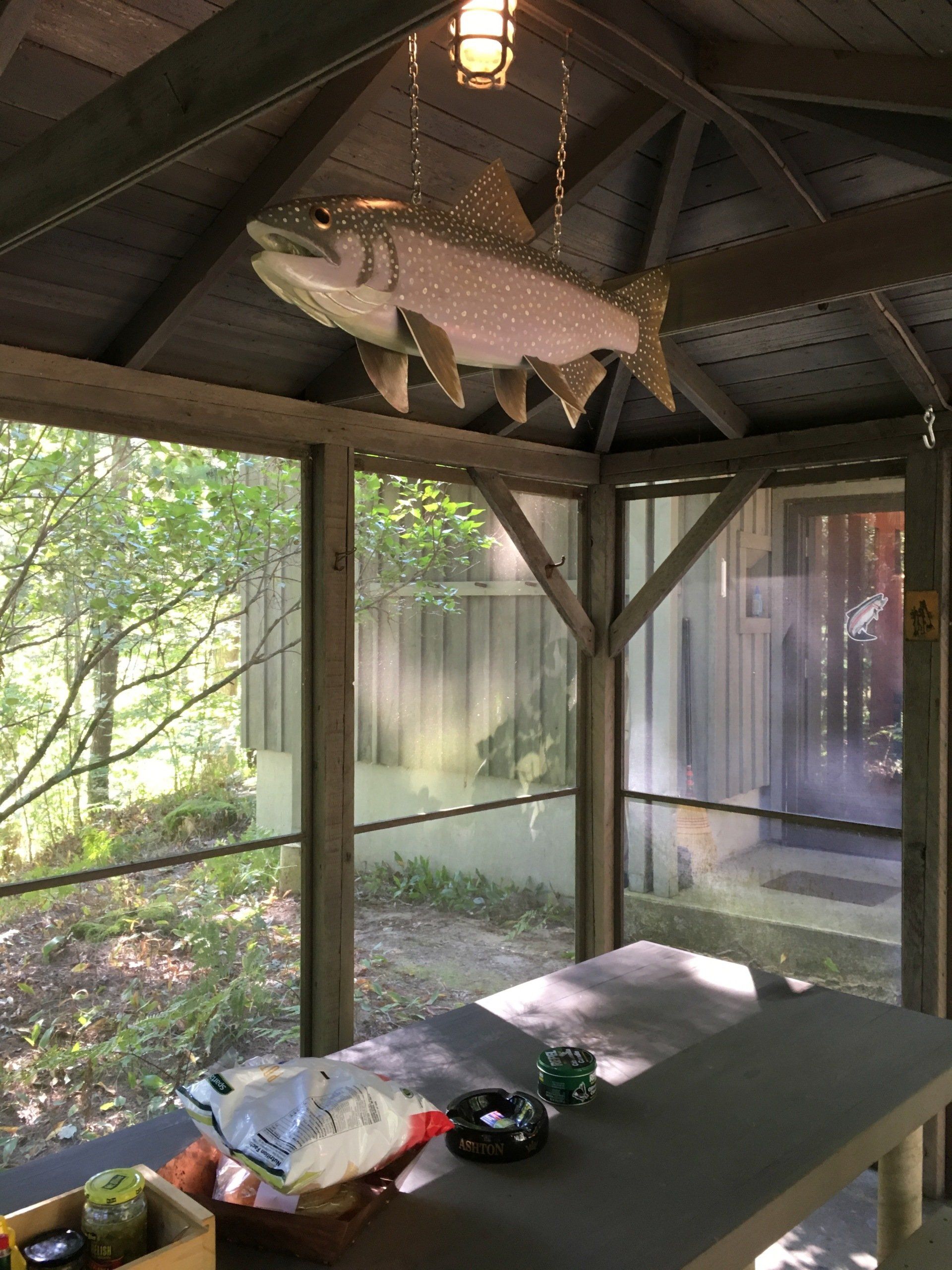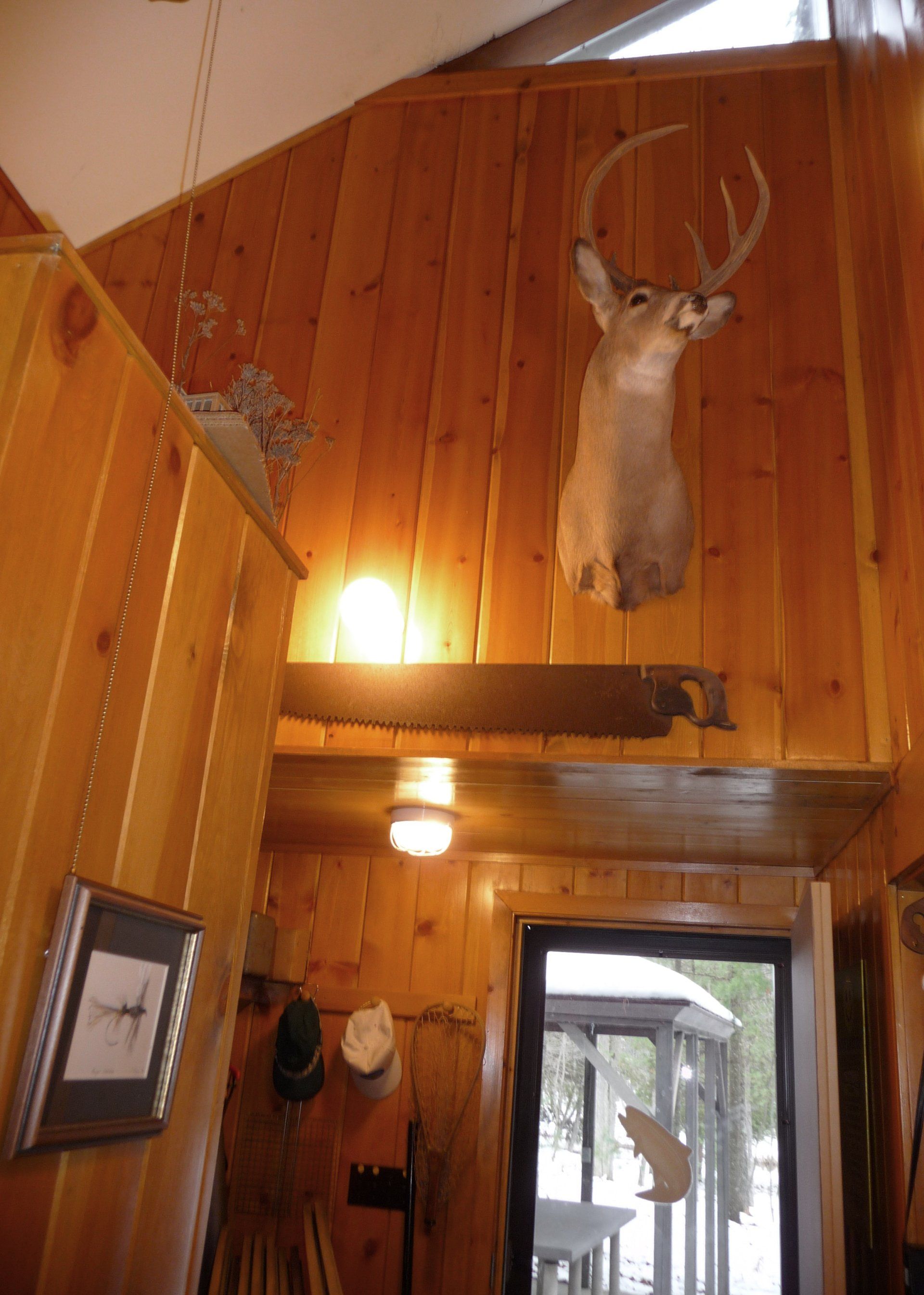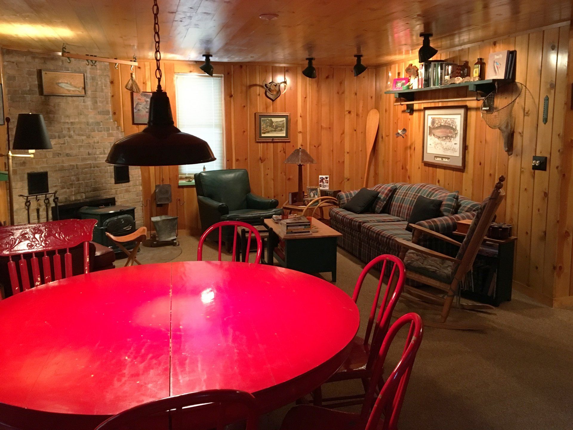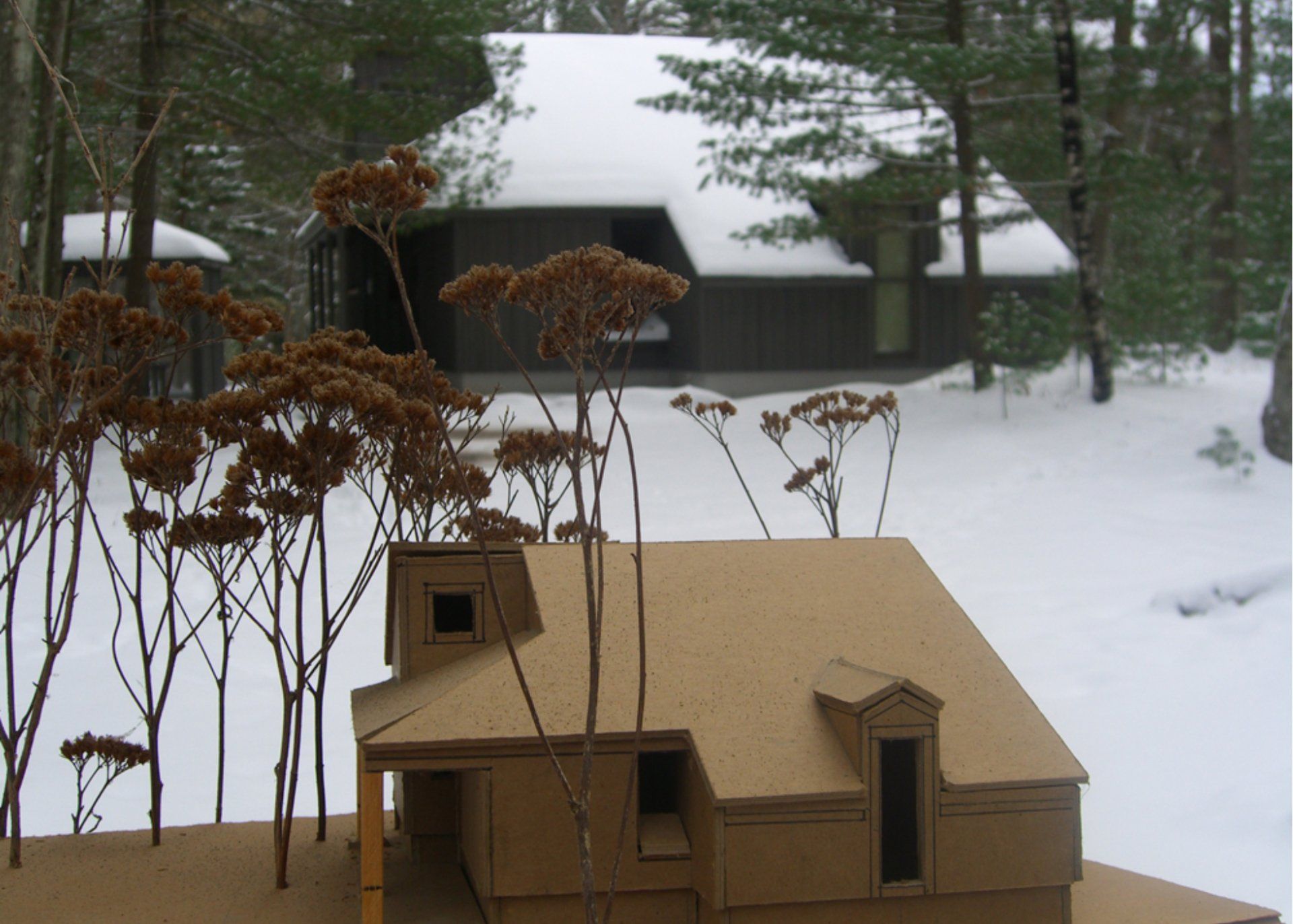 The 1985 design took a gabled roof form to cover an expanded perimeter that added an entry porch adjacent to the gazebo, a tall “fly-rod” foyer, a kitchen and a full bathroom. A bunkroom was sunk 2 feet into the ground as the roof extended down over it. An old screened porch was enclosed and the space opened into the living/dining room. A spiral stair accesses the new sleeping loft. The interior is finished in knotty pine, the exterior in board and batten cedar.
