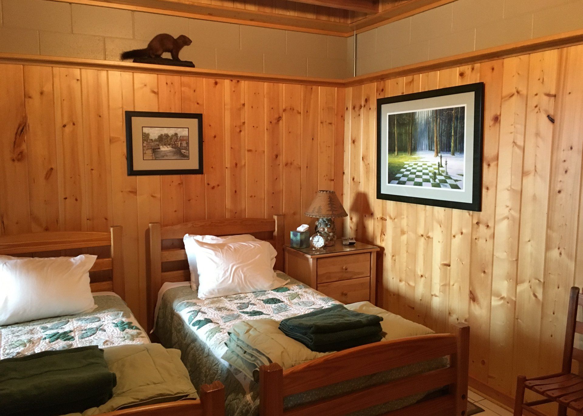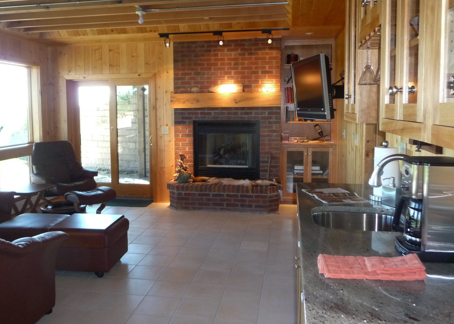 This vacation home is sited 300 feet above Grand Traverse Bay. It was originally designed by Suttons Bay architect Glenn Arai as a one story shed on a post and beam foundation. The entire house was lifted to excavate a lower level for 2 bedrooms, bathroom, laundry/utility room and knotty pine walled living space for their guests. The original floor framing and underside of the wood flooring was beautiful enough to expose as the lower level ceiling, detailed with a perimeter soffit. The walk-out patio with a wrap-around deck positioned above serves the main level. The 1,000 square foot home became 2,000.