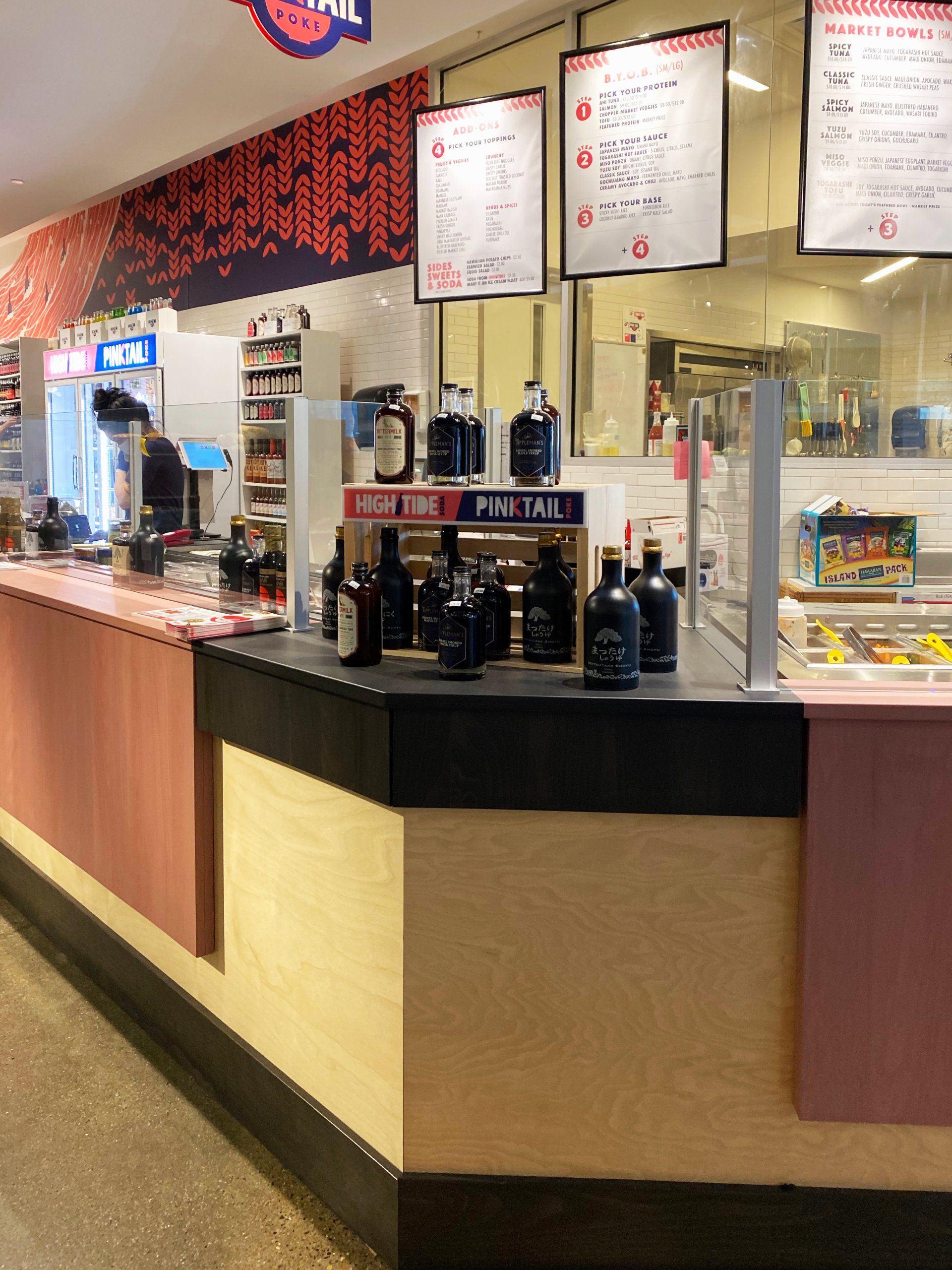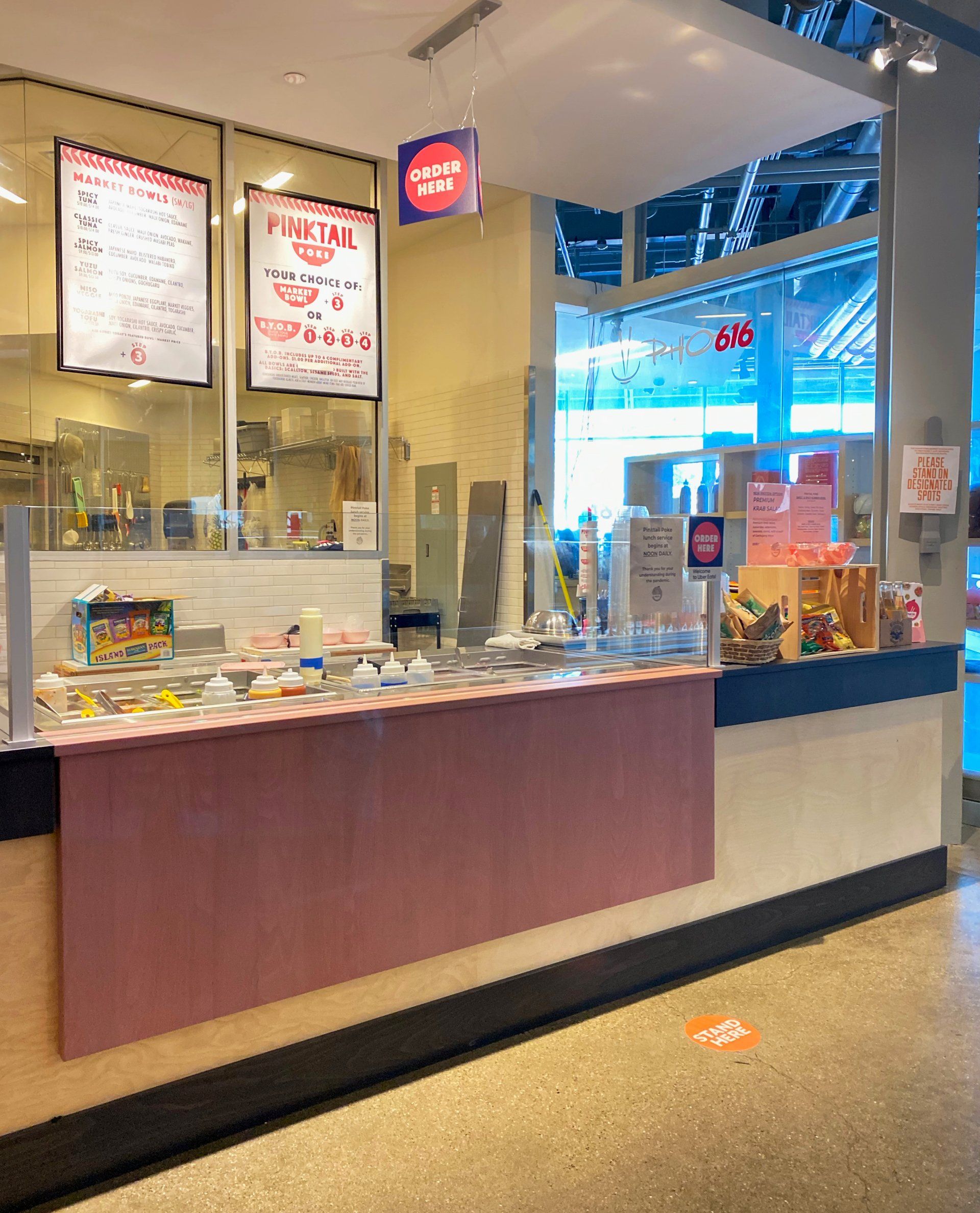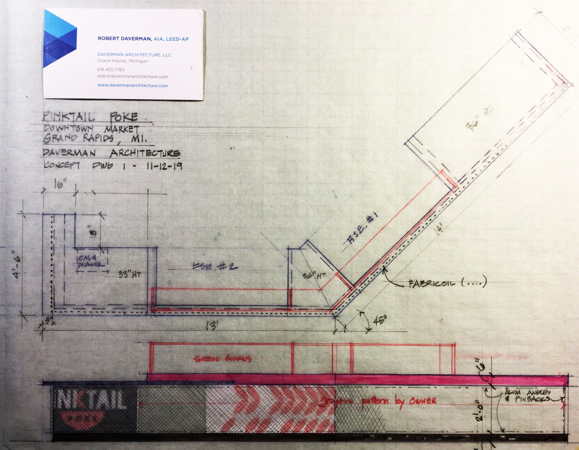 The Owner of Fish Lads and Carvers asked a contractor to come up with a design and cost for his new line of market meals, PINKTAIL POKE. The contractor recommended a budget of $50,000, way out of the realm of possibility. Geoff asked me for help. My design approach was in arriving at a cost-effective counter concept that emphasized the branding while complimenting the foods. Discussing my concept drawing with Ryan Oldenburg Carpentry, we selected Baltic Birch cabinet faces with counters and drop panels of solid Beech that served both strength and contemporary design ideas. Welded tube-steel underframes provides great strength. Clear stains in pink and dark grey focuses food choices and products – finished by Knol the Painter. The entire project was completed before the scheduled opening date for under $20,000 including my fee.