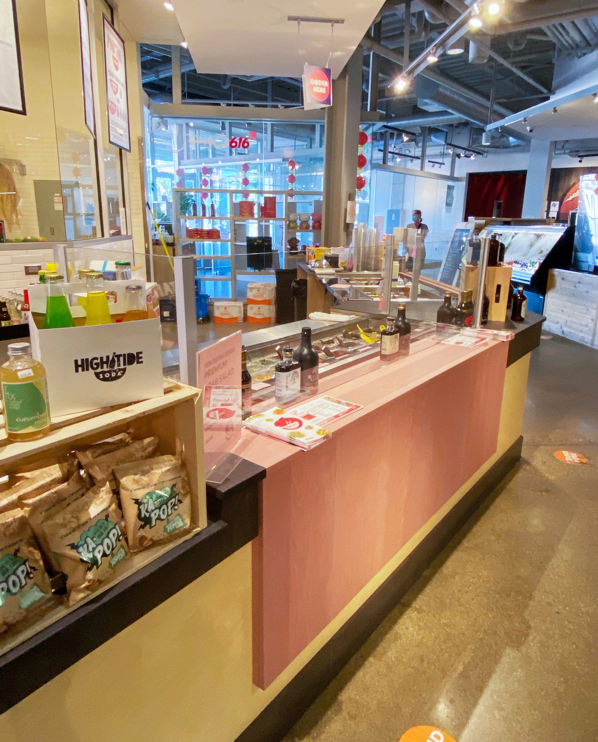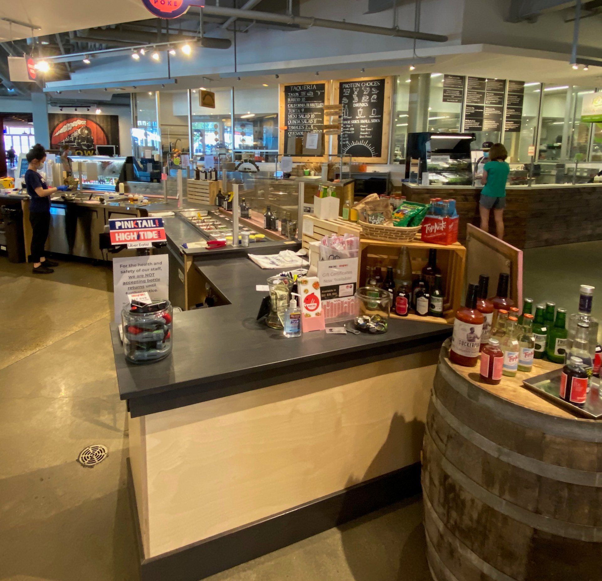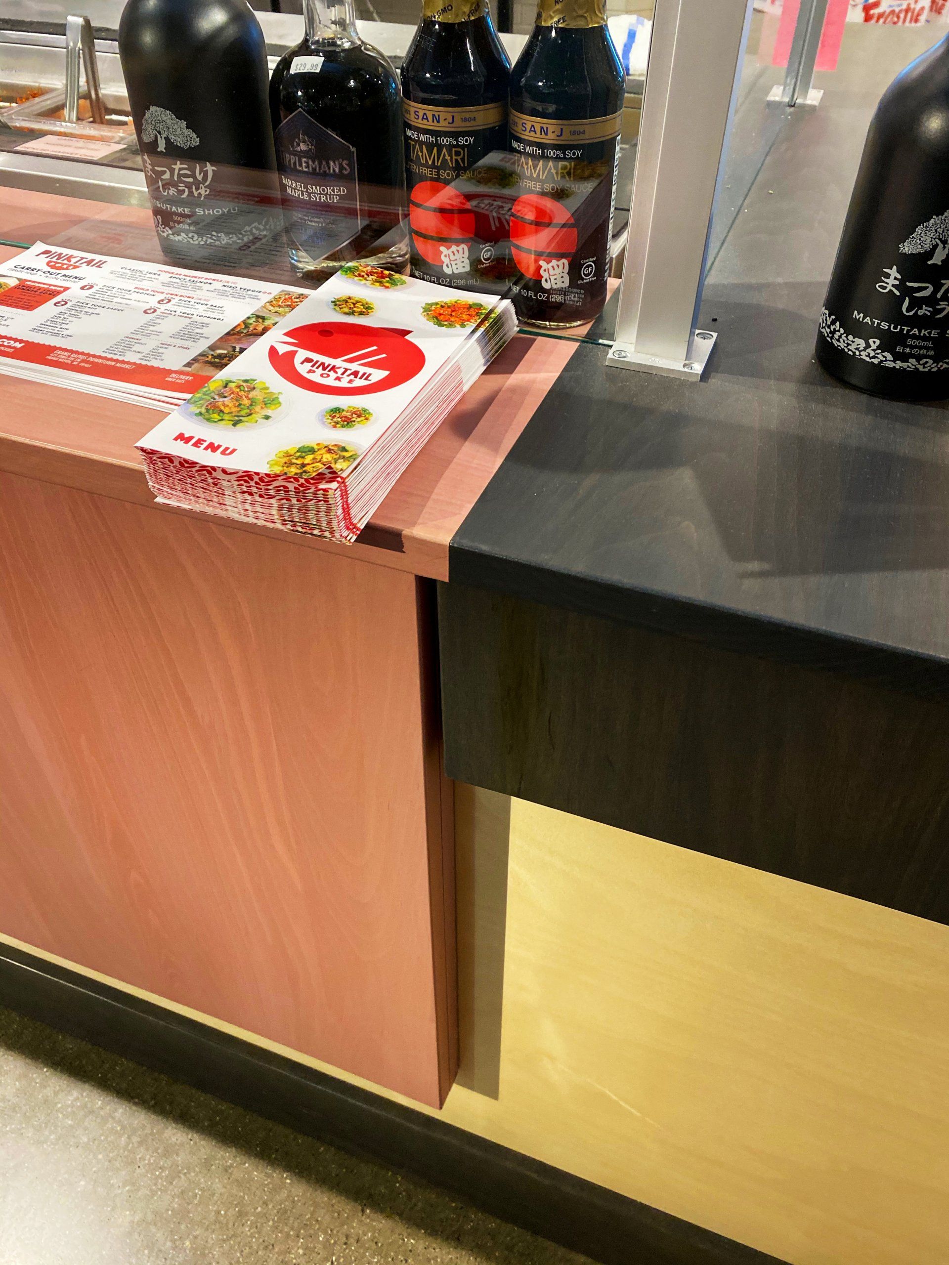 The Owner of Fish Lads and Carvers asked a contractor to come up with a design and cost for his new line of market meals, PINKTAIL POKE. The contractor recommended a budget of $50,000, way out of the realm of possibility. Geoff asked me for help. My design approach was in arriving at a cost-effective counter concept that emphasized the branding while complimenting the foods. Discussing my concept drawing with Ryan Oldenburg Carpentry, we selected Baltic Birch cabinet faces with counters and drop panels of solid Beech that served both strength and contemporary design ideas. Welded tube-steel underframes provides great strength. Clear stains in pink and dark grey focuses food choices and products – finished by Knol the Painter. The entire project was completed before the scheduled opening date for under $20,000 including my fee.