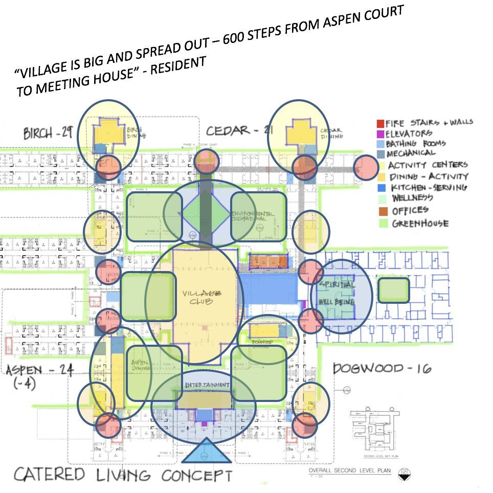 My research began with the sales group. To get them to think of me not as a Board member, I introduced myself as a “nephew” whom my “Uncle Bob” asked to help him find a new home with quality care following a disabling health episode. Two weeks later, I “checked in” at the Village as “Uncle Bob” for a typical orientation, shown my apartment, and introduced to my neighbors and care staff. I stayed 3 days and two nights. I led discussions of further inquiry with a group of residents, then with staff, and lastly the committee who asked me to think “out of the box”. All were profound sessions and living there greatly sensitized me to design thought.