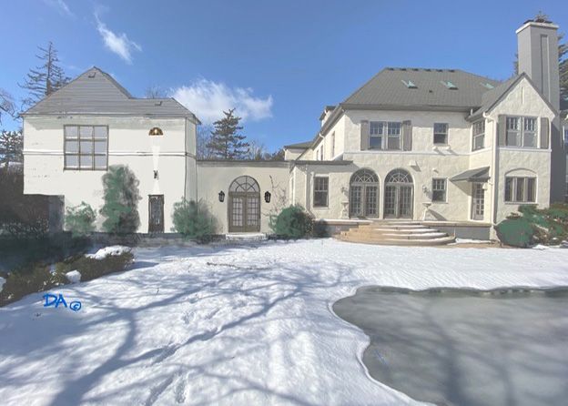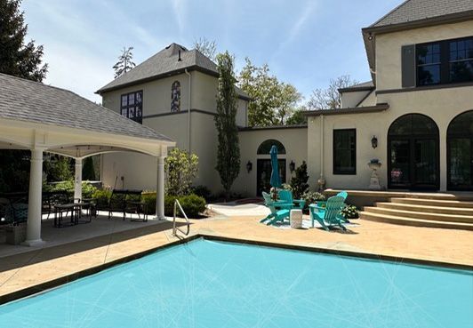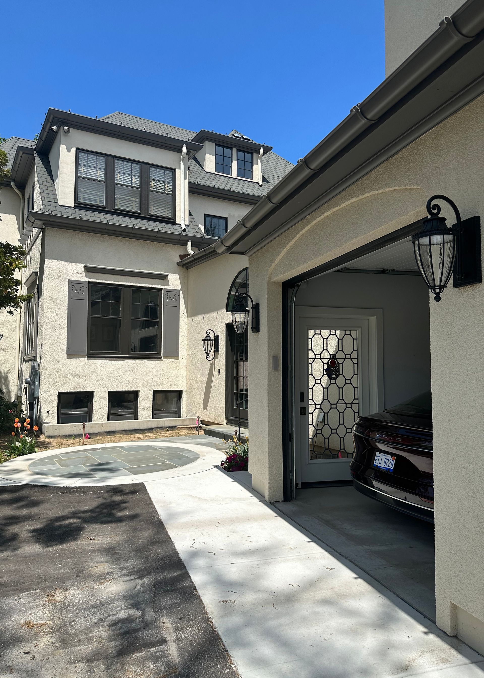 Phase 2, the addition, was completed in the spring of 2023. The design program for the addition comprised of the one-story entrance atrium connecting the main house at the kitchen to the larger two-story addition containing a 2-car garage, a mudroom, a bathroom associated with the swimming pool patio, and a generous 2nd floor office connected by a staircase overlooking the patio through a 9-square window ensemble. The two-story addition is angled to the property line for ease of driveway access – but this importantly keeps the original house dominant, and the addition subservient. It frankly is just more interesting. Exterior stucco work and all detailing matches the original house. The pool patio was enhanced by a stand-alone columned gazebo.