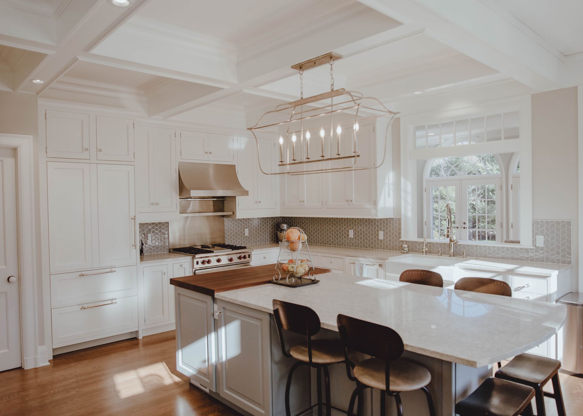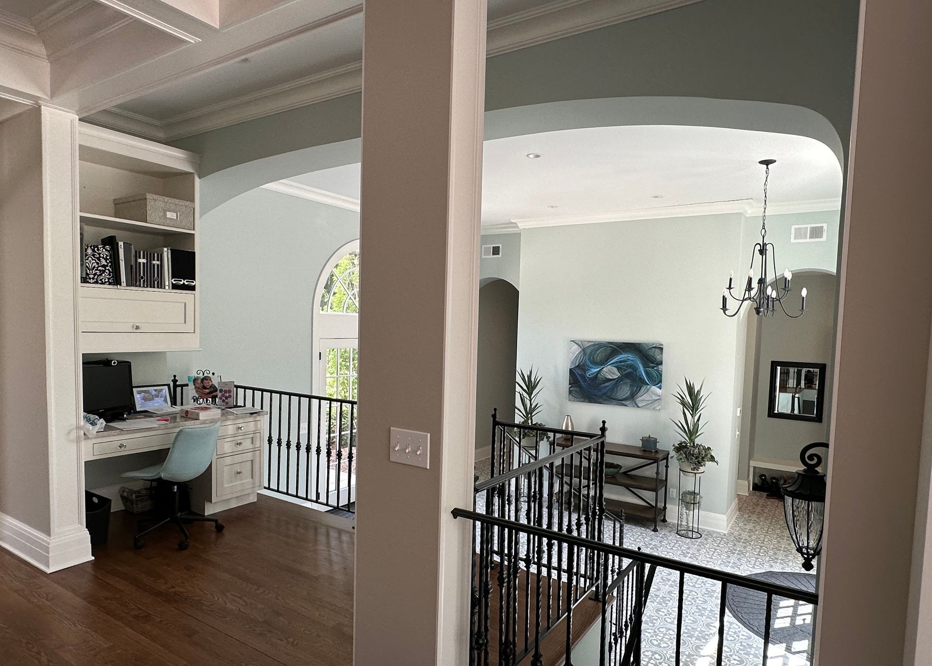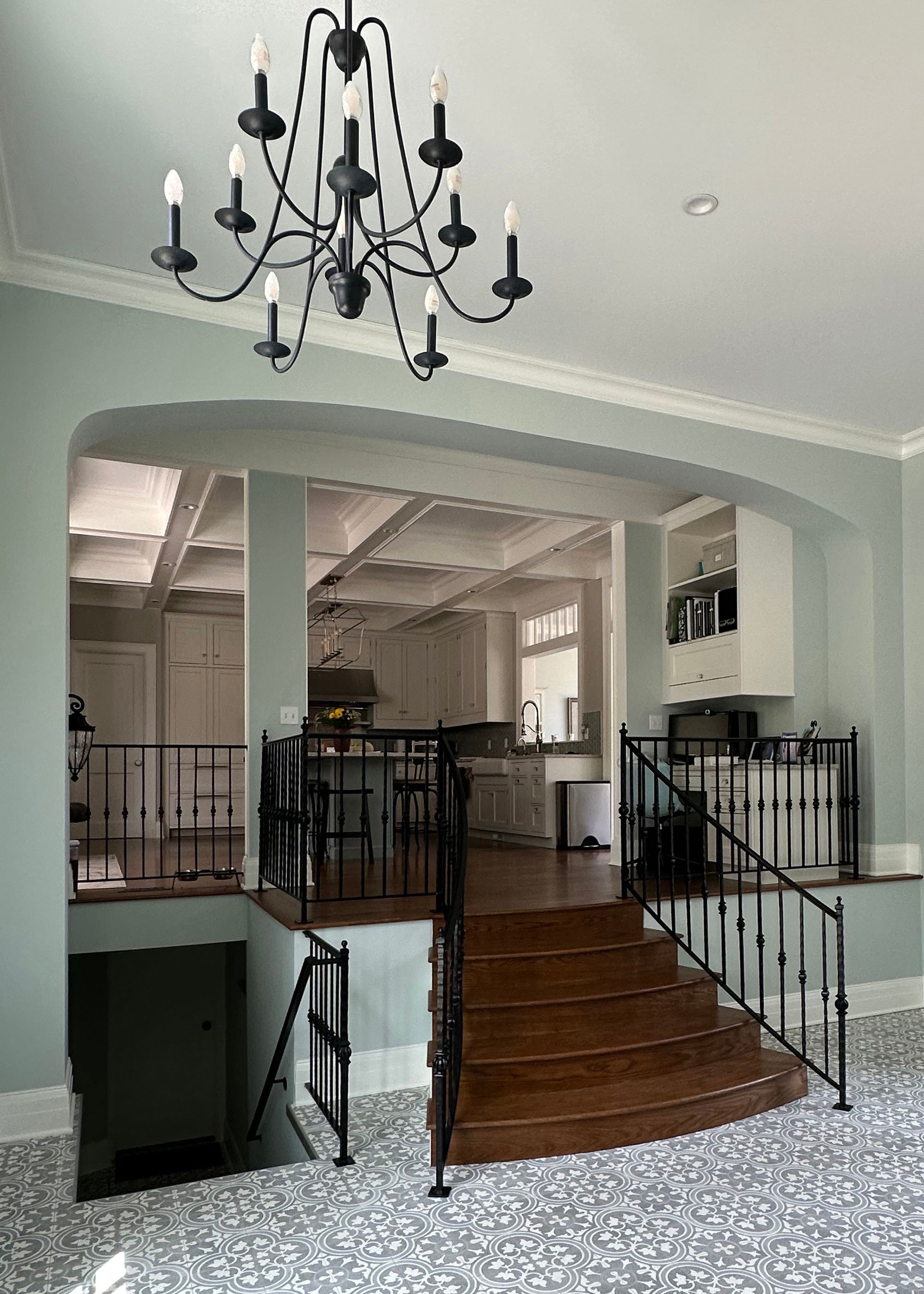 Phase 1, the interior remodeling, was completed in 2019. The most significant part of this work was the removal of the entire kitchen and the space expanded with steel structure. The steel then hidden by the magnificent, coffered ceiling trim work by Matrix carpenters. As architect, I wanted the original curved iron handrails saved, and from them I created a difficult, but graceful transition from the kitchen down to the atrium level. In Phase 2, the existing wall was opened, detailed, and shaped by a broad plaster arch.